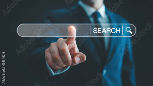 A man in a suit is pointing to a search bar on a computer screen. Concept of professionalism and focus, as the man is likely working on a task that requires him to search for information
