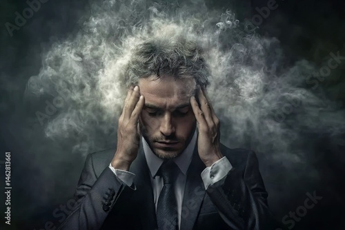 man, suit, hand, head, suffering, mental, health, issue, lot, smoke, coming, brain, dark, background, hyper, realistic, style, artist, name