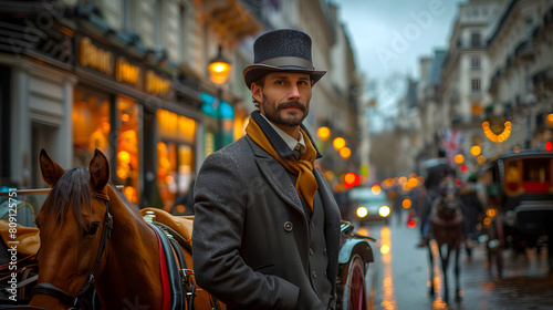 A man in a top hat stands next to a carriage. People and horses are in the background.