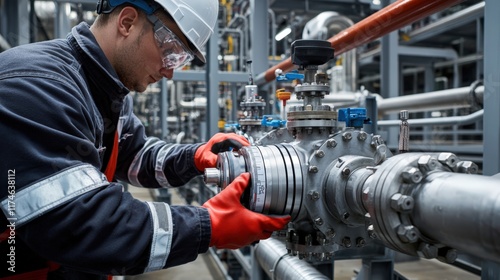 man, white, helmet, red, glove, working, pipe, engineer, industrial, precision, men at work, concept, caution, maintenance, task, technology, pipeline, technician, pump, energy, equipment, valva, control, power, repairman, electrician, plumber, system, inspector, safety, plant, production, operating, factory, check, repair, oil, water, pressure, gas, boiler, person, measuring, setting, construction, labourer, fix, manufacturing