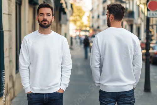 man, street, casual attire, urban, portrait, people, fashion, wear, shopping, outdoors, city, business, boutique, shop, stock, fine-looking, contemporary, adult, trendy, pavement, guy, woman, daylight, looking, 1, front view, backview, casual clothes, walking, tree, building, lifestyle, male model, modern, sweater, sweatshirt, long, sleeve, white