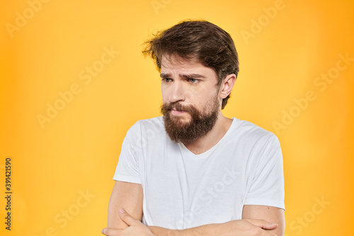 A man in a white t-shirt gestures with his hands studio lifestyle yellow background emotions