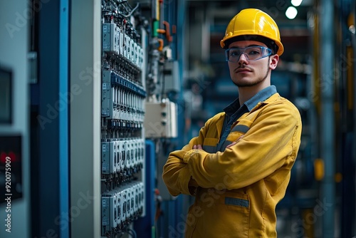 A man in a yellow jacket stands in front of a panel of electrical switches. He is wearing a hard hat and safety glasses