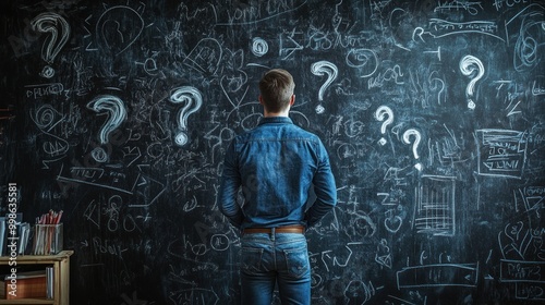 blackboard, blackboard, question, mark, man, person, jean, denim, thinking, contemplation, confused, puzzled, solution, search, answer, cognition, education, school, teacher, student, learning, study, problem, solve, scribble, writing, whiteboard, lesson, classroom, wall, background, uncertainty, doubt, curiosity, mystery, concept, idea, brainstorm