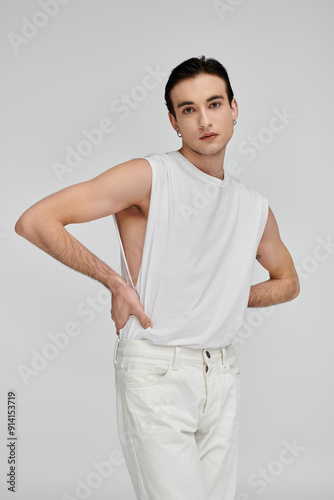 man, sexy, caucasian, young, appealing, photogenic, alluring, model, posing, pose, elegant, white, attire, vibrant, colours, portrait, style, fashion, clothing, male, photoshoot, studio, studio shot, white shirt, confident, attractive, sophisticated, chic, contemporary, modern, trendy, cool, casual attire, simple, minimalist, clean, key