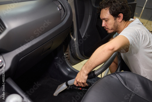 A man is diligently vacuuming the interior of a car with great care and attention to detail