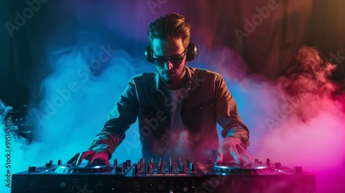 A man is playing a DJ set in a smoke filled room