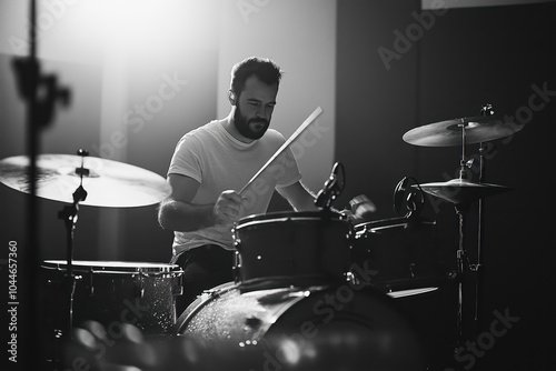 man, playing, drum, black, white, wearing, shirt, moody, intense, musical, experiencing, drummer, person, male, musician, instrument, band, concert, sound, entertainment, rock, percussion, performer, equipment, beat, artist, background, bass, stage, cymbal, jazz, kit, hand, light, drumstick, young, set, pop, professional, modern, caucasian, live, action, night, rythm, player, art, melody, rythm