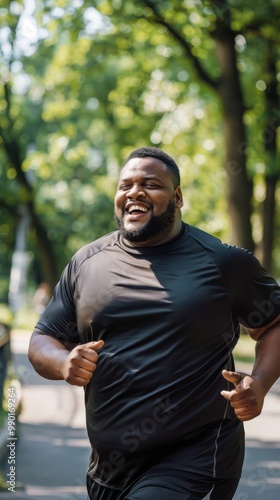 A man is running in a park with a big smile on his face