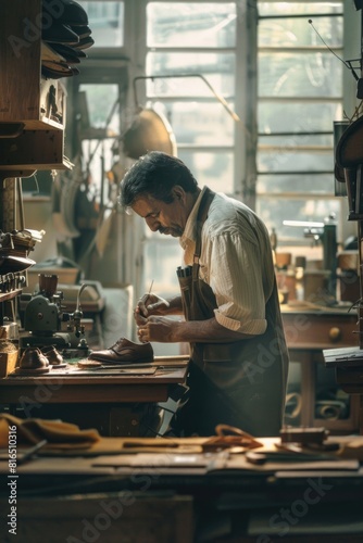 A man is seen working on a piece of wood in a workshop. Ideal for woodworking or craftsmanship projects