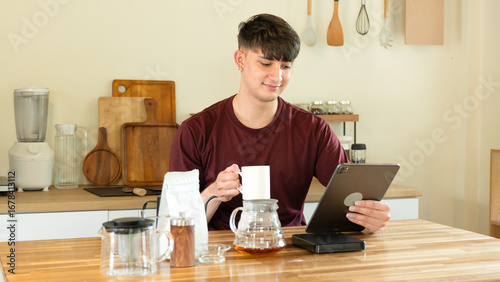 A man is sitting at a table with a cup of coffee and a tablet. He is smiling and he is enjoying his time. The scene suggests a relaxed and comfortable atmosphere, where the man can unwind
