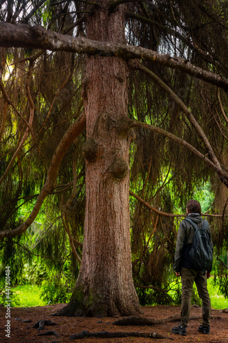 A man is standing in an autumn park next to a large tree and looking up. Aerial view of summer green trees in forest in mountains. Forest Tree Woods.