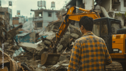 demolition, urban, redevelopment, machinery, debris, construction, observer, contemplative, transformation, community, landscape, impact, building, destruction, renewal, city, change, heavy, equipment, shoveling, debris, wreckage, development, planning, city landscape, architecture, society, social, issue, man, chequered, shirt, watching, environmental, effect, urbanisation, thoughtful, perspective, adaptation