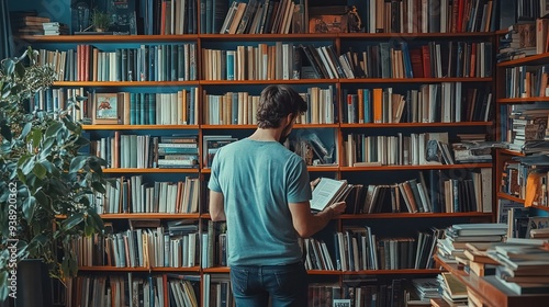 A man organizing his bookshelf, carefully placing books in order and creating a neat display.