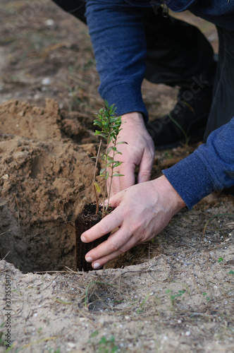 a man plants a Bush in the ground