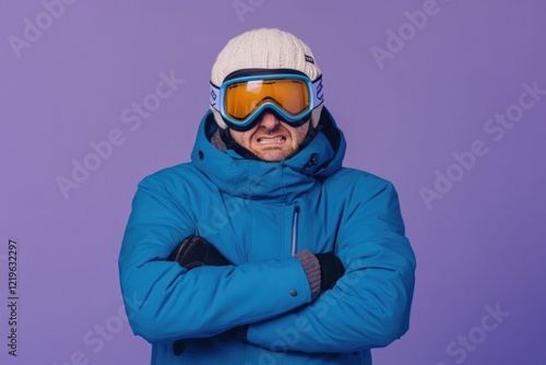 man, person, male, human, jacket, blue, goggles, pose, photo, studio, portrait, adventurer, explorer, travel, journey, discover, seek, find