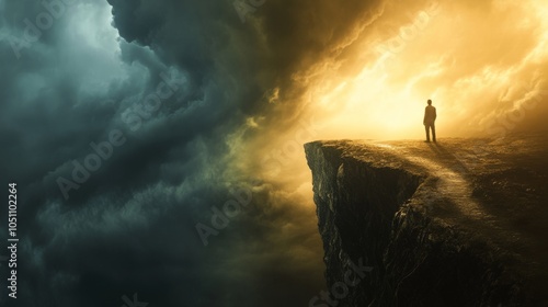 A man standing on the edge of a cliff with two paths, one shrouded in storm clouds and the other in sunlight, making decisions. generative ai