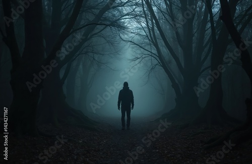 A man stands alone in a dark forest. The road leads into the fog through the silhouettes of trees. Mystery and loneliness in the surreal landscape. Monochrome colors enhance spooky atmosphere.