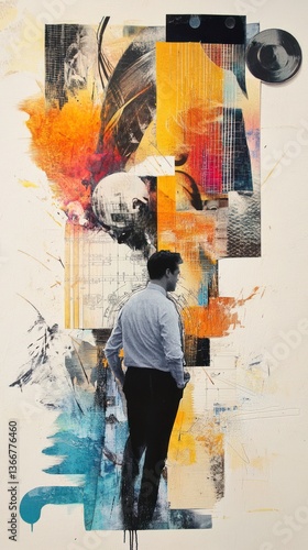 man, figure, abstract, composition, colours, paint, art, texture, design, graphic, illustration, orange, red, blue, yellow, black, white, grey, shape, geometric, pattern, block, layer, brushstroke, stroke, ink, print, collage, background, modern, contemporary, surreal, dreamlike, vision, thought, contemplation, person, human, standing, vertical, image, creative, artistic, structure, detail, surface