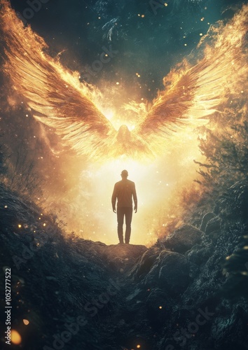 silhouette, man, wing, phoenix, fiery, fire, mythical, creature, bird, forest, dark, night, light, mystical, supernatural, magic, power, hope, faith, belief, spirituality, religion, fantasy, dream, imagination, art, graphic, design, digital, illustration, abstract, surreal, concept, symbol, spiritual, freedom, ascension, rebirth, rise, transformation, divine, celestial, angelic, sky, cloud, glow, gold, yellow, blue