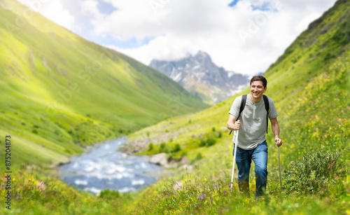 adventure, hike, lifestyle, holiday maker, happy, summer, hiker, camper, 1, trip, travel, active, vacation, sport, activity, meadow, river, field, mountain, alpine, nature, landscape, rest, walk, cloudy, green, rock, cloud, scenery, untouched, wild, grass, background, countryside, copy space, backpack, going up, smiling, alone, outside, man, mountain, hiking, view, hill, trekking, journey