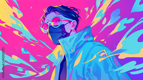 a man wearing a mask, anime style, cute kawaii, simple, smiling happy, neon psychedelic background
