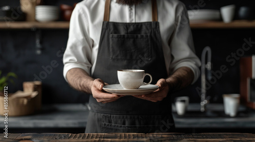 A man wearing an apron is holding a white plate with a cup on it. The man is in a kitchen setting