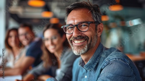 A man wearing glasses and a denim shirt smiles brightly while sitting at a table during a meeting with his colleagues in a modern, well-lit office environment.