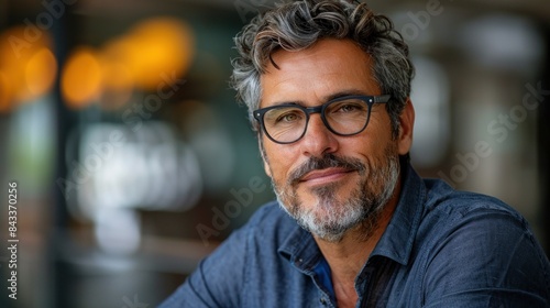 A man wearing glasses smiles with a confident expression while looking directly at the camera