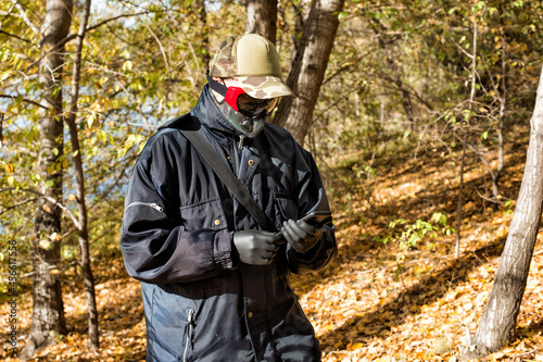 A man wearing respirator mask and dialing a smartphone walking in the forest at COVID-19 period.