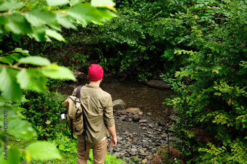 A man with a backpack walks along a forest path along a mountain river and enjoys the beautiful nature. Outdoor adventure. Hike along the hiking trail. Travel and exploration. Healthy lifestyle