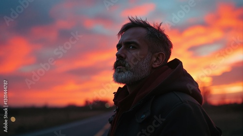 A man with a beard and a jacket standing on the side of a road, gazing into the distance with a backdrop of a fiery sky painted in hues of orange, red, and blue.