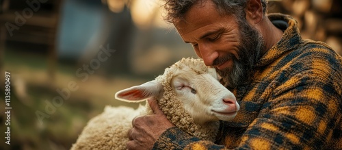 man, beard, plaid, shirt, lamb, animal, farm, love, care, happy, smile, cuddle, gentle, hold, sheep, white, fur, nature, countryside, rural, country, agriculture, farm animal, animal husbandry, pet, domestic, cute, innocent, farmer, country life, animal welfare, kindness, compassion, tenderness, friendship, bond, connection, outdoors, field, grass, green, background, light, sunset, evening, gold