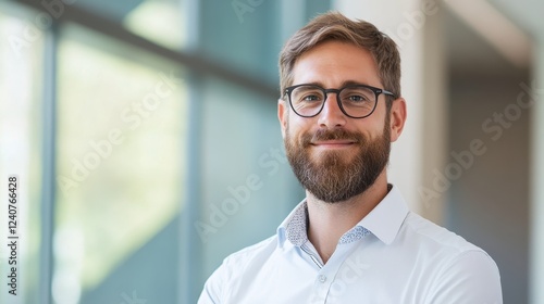 A man with a beard and glasses smiles confidently in a bright, modern environment.