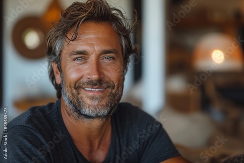 A man with a beard and gray hair is smiling and looking at the camera. He is wearing a black shirt and he is in a relaxed and happy mood