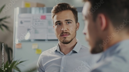 A man with a beard and mustache wearing a blue shirt looking intently at another person in a professional setting with a whiteboard in the background.