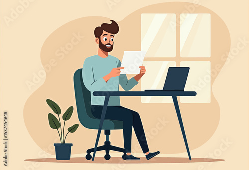 A man with a beard is seated at a desk, looking at a piece of paper, with a laptop open in front of him.