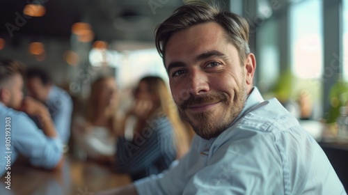 A man with a beard sitting at a table. Suitable for various concepts and designs