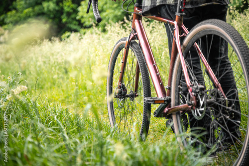A man with a bicycle in the forest among the grass.