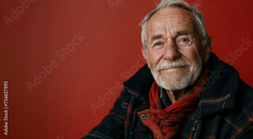 A man with a red scarf and a brown jacket is smiling. Portrait studio shot of an attractive, healthy senior man smiling relaxedly isolated on red background
