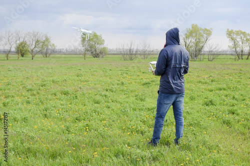 A man with a remote control in his hands. Flight control of the drone. Phantom