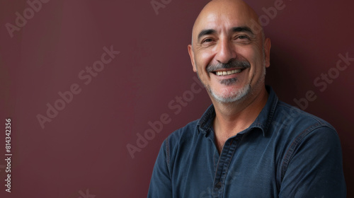 bald, man, beard, smile, wear, blue, shirt, red, background, happy, photogenic, face, pose, grin, honest, trendy, cheerful, relax, mature, fashion, chin, blissful, portrait, dress, neck, orient, please, eye, indie, dapper, photo, joyful, friendly, sincere, well, teeth, stylish, facial, structure