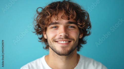 man, curly, hair, beard, smiling, camera, wearing, white, blue, portrait, young, guy, shirt, person, male, background, attractive, face, adult, happy, photogenic, casual attire, model, isolated, fashion, confident, caucasian, expression, style, cheerful, lifestyle, studio, looking, modern, 1, closeup, standing, cool, happiness, youth, american, ethnicity, positive, space, photogenic, laughing, hispanic, afro, coiffure