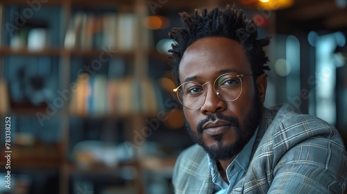 human, face, person, clothing, man, indoor, book, beard, goggles, shelf, wearing, portrait, afro, black, bookshelf, cup, pigtail, hair, stare, wear, dreadlocks, sitting, front, bookcase