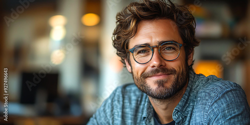 A man with wavy hair and glasses, wearing a casual shirt, is smiling in a warmly-lit room with a blurred background, ideal for use in lifestyle, work-from-home, or professional profiles,