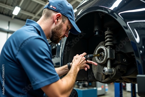 A man working on a vehicle in a garage setting, with tools and machinery nearby