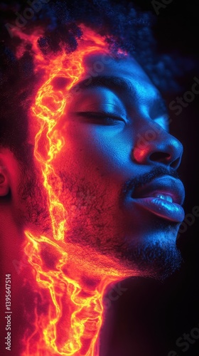 man, face, portrait, art, light, fire, flames, neon, colourful, dark, black, blue, red, orange, stylish, beauty, photo, model, fashion, closeup, modern, glow, energy, head, neck, portraiture, creative, vibrant, colours, style, intense, bold, attractive, expression, calm, relaxed, powerful, skin, afro, hair, texture, passion, sharpened, fierce, fiery, abstract