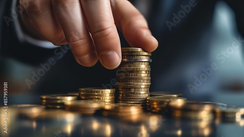 A man's hand carefully places one gold coin on top of a stack in a strategic financial management scene.