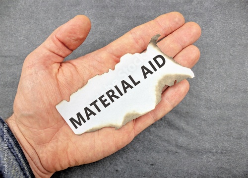A man's hand holds a leaf burnt with the inscription MATERIAL AID. The concept of helping those approaching, refugees as a result of war, fire or tragedy.