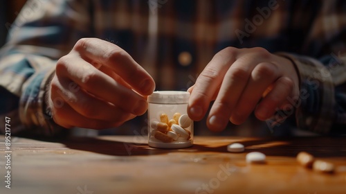 A man's hands is taking medicine from pill bottle, close-up view. Generative AI.
